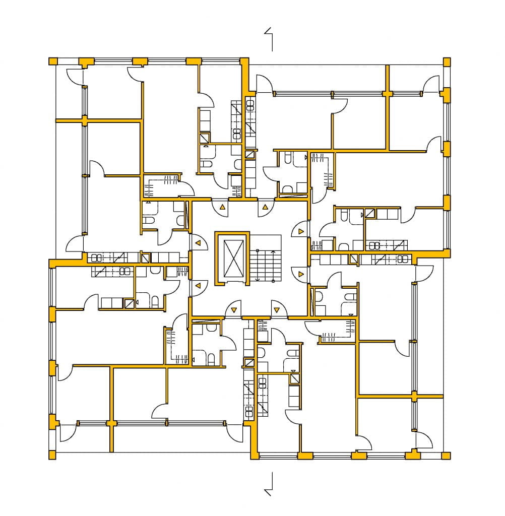 Här är ett exempel på ett hus med 31 lägenheter, hälften två rum och kök på 52 m², hälften ett rum och kök på 34 m². Huset är tänkt att byggas på oexploaterad mark i villaområden. Det är därför bara fyra våningar högt. Varje våning innehåller dock åtta lägenheter, entréplanet sju, så trots det innehåller huset 31 lägenheter.