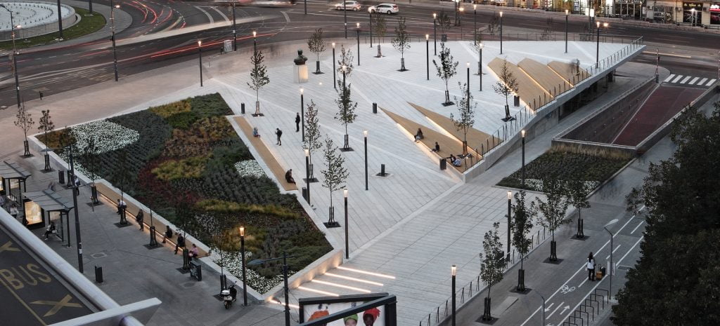 Bilden är från centrala Belgrad. En ödetomt i ett tätt trafikerat område fått ny skepnad med en stor plantering och en stensatt, delvis sluttande yta med bänkar och träd.