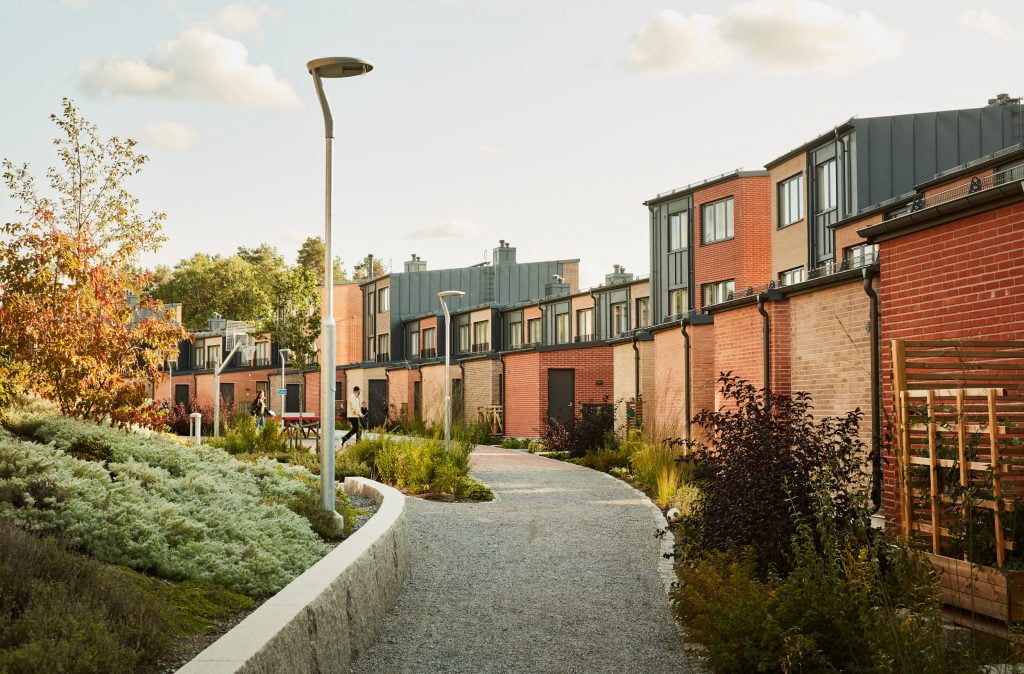 Området var ett gammalt sommarstugeområde med små hus på stora tomter där vi på uppdrag av Solvinkeln AB ritat parhus och attefallshus, Av sexton tomter, varav hälften var obebyggda, har vi skapat sju gånger fler bostäder, alla med egen tomt och uteplats. Snart är alla hus monterade och under nästa år flyttar de nya ägarna in. Är du intresserad av att bo 4,5 meter från naturen? Tyvärr är det här området redan slusålt, men var inte ledsna. Inom kort börjar nästa etapp med ytterligare 66 bostäder. Från dem är det aningen längre till skogen, men å andra sida närmare till sjön. Kontakta Solvinkeln AB för mer info.