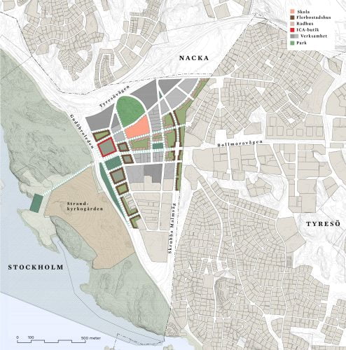 • Parkering: förslaget innehåller ca 1 000 parkeringsplatser på kvartersmark för boende och kunder till handeln i bostadskvarteren. Utöver detta tillkommer ett stort antal p-platser som kantstensparkering på gatumark