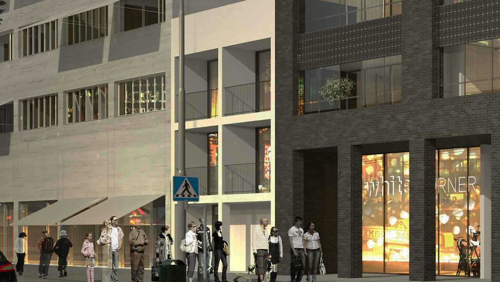 Att tillvarata små, smala tomter mellan större byggnader har länge varit en del av stadsbilden i större städer med dyra markpriser. Ola Anderssons nya byggnad på Bobergsgatan i Norra Djurgårdsstaden byggs på en typisk, liten tomt med klassiska Manhattan-mått (8 meter x 25 meter).