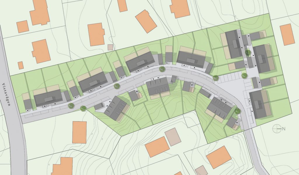 Alla bostäder har en egen, avskild uteplats och en liten trädgård. I tvåplanshusen vänder sig ett stort allrum på entréplanet mot uteplatsen. I husen med souterrängvåning ligger de stora öppna gemensamma ytorna mot uteplatsen en trappa upp från entrén. Parkering finns längs den gemensamma gatan och på den lilla öppna platsen i norra delen. Förskola finns på granntomten. Till Fullersta gård går du tio minuter och till Huddinge station på femton. Fortfarande finns några hus till salu. Om du är intresserad, klicka här: https://www.svenskfast.se/nyproduktionsprojekt/stockholm/huddinge/huddinge/fullersta/vistabergshojden/336870 eller på byggherrens hemsida: https://solvinkeln.se/vistaberg/