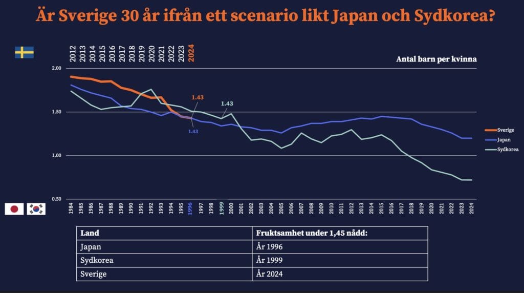 Mot den bakgrunden framstår Sveriges nuvarande politik som synnerligen självdestruktiv. Målet att ha Europa lägsta invandring, en bostadspolitik som fortsatt lyser med sin frånvaro, och den begränsning av bidrag til familjer med många barn som regeringen presenterades samma vecka som seminariet är inte bara ett misstag, det är att sikta med ett grovkalibrigt vapen mot den egna foten och trycka av.