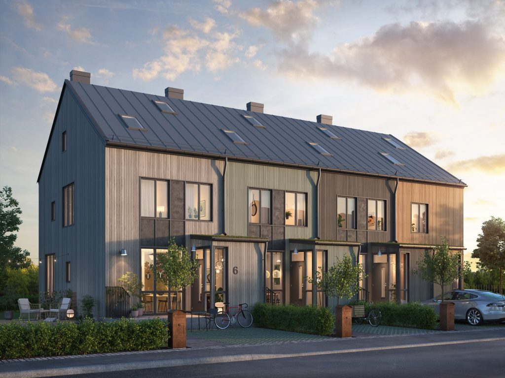 Varje hus ges sin egen kulör och tillsammans med stuprör, takhuv och, där det finns, takkupa accentuerar husens höjd och självständighet, med en lågmäld sober samtida träarkitektur i ljusa kulörer och obehandlat trä, plåttak och generösa fönster. De längre huslängorna har också en eller ett par höjdförskjutningar som skapar variation och anpassning till terrängen.